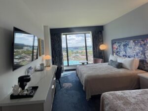 Our Deluxe two Queen bed room was spacious and comfortable. Controlling the drapes, lights, television, and shower from the in-room tablet was a fun touch. The room views of Epic Universe, day and night, were incredible.
