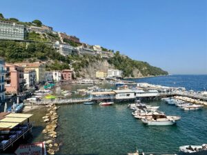 This was our gateway to the Amalfi Coast. We chose to visit Sorrento, a coastal gem with lemon-scented streets, artisan shops, and dramatic seaside cliffs. It’s ideal for those looking for idyllic scenery and a slower pace. We decided to explore Sorrento on our own and walked through the cobblestone streets starting at the Piazza Tasso, down to the Marina Grande, and back up to Piazza della Vittoria where the views of the Gulf of Naples and Mount Vesuvius are spectacular! Along the way we sampled limoncello and stopped at a tiered café with views of the marina and gulf for a delicious lunch of paninis and caprese salad.